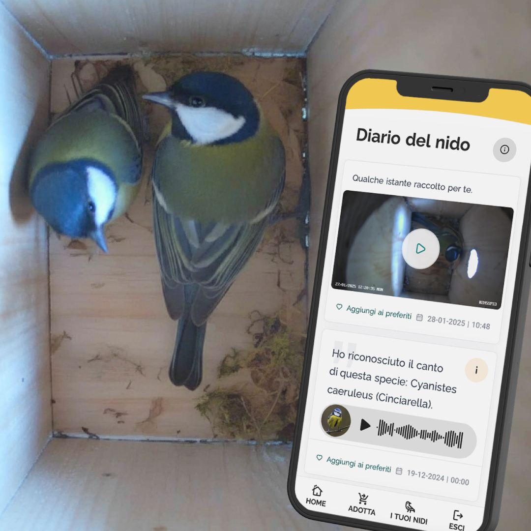 Puoi monitorare i progressi del nido nel "diario digitale" con tutti i video registrati dalla telecamera, i suoni dei canti e altri aggiornamenti.
